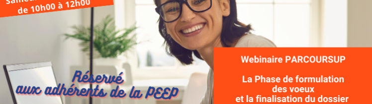 Réservé aux adhérents de la PEEP La PEEP vous propose un Webinaire pour aborder Parcoursup  avec vos enfants sur le thème « La Phase de formulation des voeux et la finalisation du dossier ». Il se déroulera le samedi 3 février de 10h00 à 12h00. Intervention de Jérôme TEILLARD, Inspecteur général de l’Education, du sport et de […]