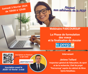 La PEEP vous propose un Webinaire pour aborder Parcoursup  avec vos enfants sur le thème « La Phase de formulation des voeux et la finalisation du dossier ». Il se déroulera le samedi 3 février de 10h00 à 12h00.